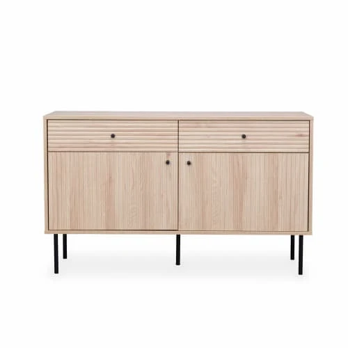 Vous souhaitez faire d’un style contemporain l’élément central de votre décoration ? Ce grand buffet avec de nombreux espaces de rangement est la pièce qu’il vous faut ! Avec son design élégant et sa simplicité, ce meuble mettra en avant le charme authentique du bois grâce à sa couleur naturelle. Une touche de modernité viendra compléter l’ensemble grâce à ses beaux détails en métal noir mat. Son décor rainuré sublimera votre mobilier et ne manquera pas d’habiller votre pièce de la plus élégante des manières.