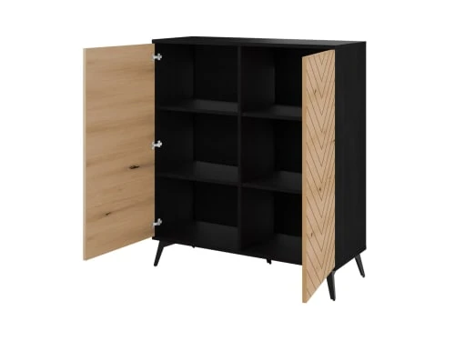matière : Matières principales : Panneaux de particules – Epaisseur panneau et étagères : 16 mm – Finitions : Mat – Système d’ouverture push to open – Pieds en métal noir – Résistant à l’humidité et aux rayures – Charge maximum : 25 kg