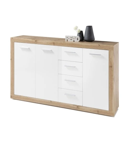 Découvrez notre commode de rangement 3 portes 4 tiroirs IBIZA pour meubler votre pièce avec élégance et apporter un élément de rangement pratique et organisé.Caractéristiques produit:Commode 3 portes + 4 tiroirs1 étagère derrière chaque portePosée sur piedsLarges poignées aspect métalPoids de charge max plateau supérieur et socle : 10kgPoids max par étagère et par tiroir: 5kgMeuble livré en kit. A monter sois-mêmeMADE IN EUROPEDimensions:Longueur 152 cm X Profondeur 37 cm X Hauteur 88 cmPoids 48 kgCompositions:Structure et façades en panneaux de particules 16mmDécor papier blanc brillant et chêne sauvageDimensions colis:Colis n°1: L 120 cm x P 37.5cm x H 13 cm – Poids 27 kgColis n°2: L 165 cm x P 44 cm x H 8 cm – Poids 25 kg