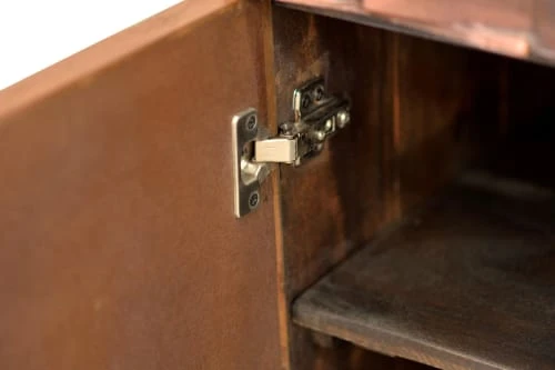 Buffet avec 3 portes, 3 tiroirs et 1 étagère dans chaque trou. Fabriqué en bois de manguier massif. les détails des tiroirs sont en bronze, faits à la main. piètement en fer. Dimensions du tiroir : 18 cm de haut x 41 cm de large. dimensions intérieures des tiroirs : 13cm de hauteur x 36cm de largeur x 32cm de profondeur. hauteur de l’étagère intérieure : 20 cm. hauteur des pieds : 18cm. produit livré monté.