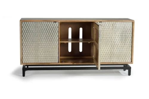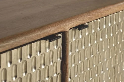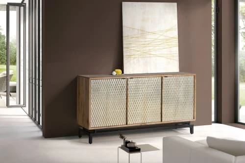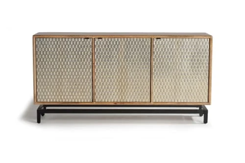 Buffet 3 portes en bois de manguier et piètement en métal. couleur : naturel, noir et argent. Dimensions : 88 cm de haut x 175 cm de large x 40 cm de profondeur. poids : 85 kg dimensions emballage : 85x184x49cm