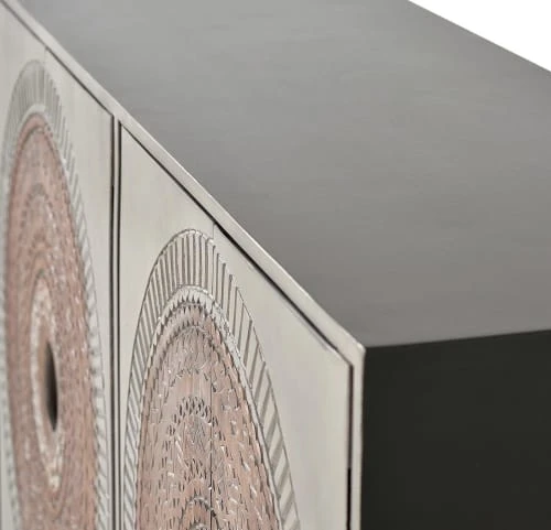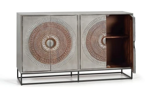Buffet 4 portes en bois de manguier et piètement en métal, avec détails sculptés à la main. – dimensions de la porte : 71 x 35 cm – hauteur des étagères intérieures : 40 et 30 cm – hauteur des pieds : 16 cm