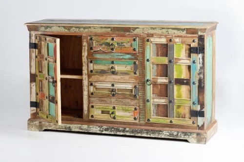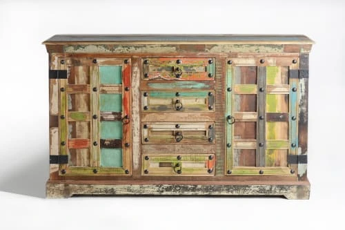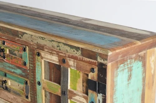 Buffet avec 2 portes et 3 tiroirs centraux en bois de bateau recyclé et meubles anciens. Détails clous vieillis. Dimensions : 90 cm de haut X 150 cm de large X 40 cm de profondeur. Volume 0.35m3. Poids : 50 kg.