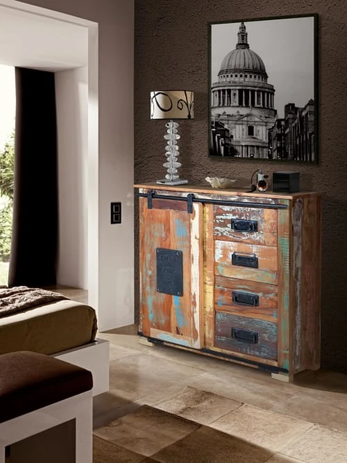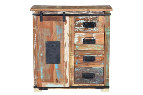 Buffet avec 4 tiroirs et 1 porte coulissante avec étagère intérieure. Fabriqué à partir de bois recyclé provenant de la démolition de navires et de vieux meubles. La conception peut varier en raison de la nature de ses matériaux. Mesure 80 cm de haut X 80 cm de large X 38 cm de profondeur. Volume 0,24 m3. Poids 26 kg.