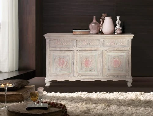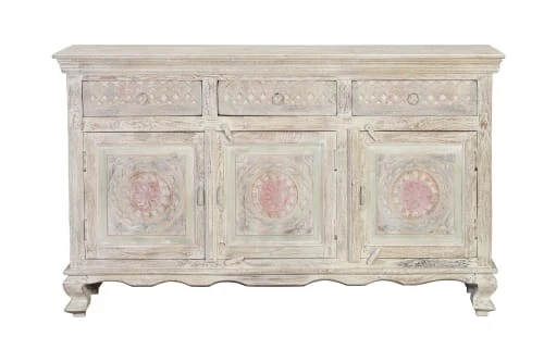 Buffet à 3 portes et 3 tiroirs en bois de manguier, avec étagères intérieures. Sculpture manuelle et finition polychrome. Taille de la porte : 43×41. mesure des façades : 11x39cm. dimensions intérieures des tiroirs : 9x35x29cm. hauteur de l’étagère intérieure : 21 cm. hauteur des pieds : 15cm. Dimensions totales : 90 cm de haut X 150 cm de large X 40 cm de profondeur. Poids : 72 kg.