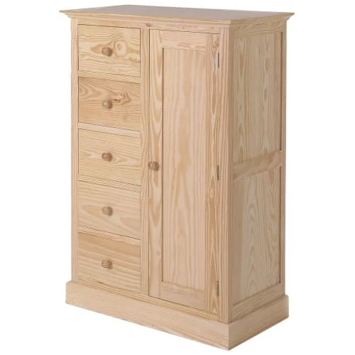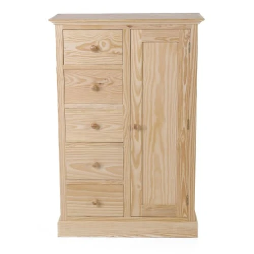 Informations techniques : Dimensions : L x P x H : 80 x 40 x 120 cm. Poids total du produit : 40.5 kg. Informations additionnelles : Armoire 5 tiroirs, 1 porteLivré assemblé Dimensions interieures tiroir : L28 x P28 x H16 cm 2 étagères amovibles et ajustables. Matière : Pin. Détails matières : Pin massif brut. Conditionnement : 1 colis : 82 x 42 x 122 cmPoids : 42 Kg