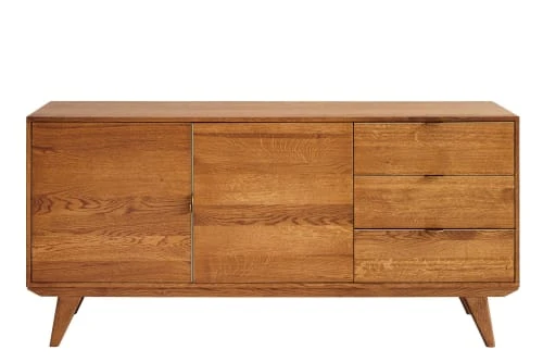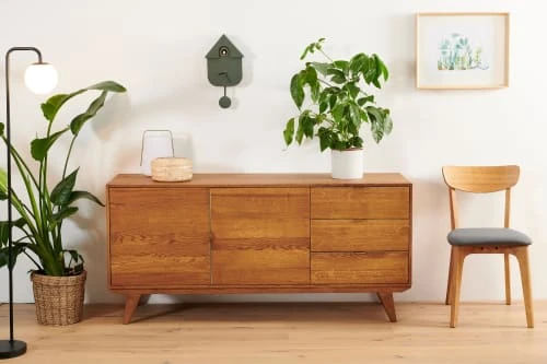 Plongez votre salle à manger dans une ambiance rétro bohème avec ce buffet bas en bois.Un buffet bas avec de nombreux rangementsInspiré du mouvement Art déco, ce grand meuble de salle à manger offre un espace rangement accessible par deux portes aux poignées design en métal bronze. Agencé d’une tablette en chêne réglable en hauteur, il saura accueillir toute votre vaisselle et votre linge de table.La partie latérale du meuble est aménagée de trois grands tiroirs, à coulisses métalliques et fermeture progressive. Il faudrait vous parler aussi de son design, mais vous l’avez déjà senti, ce meuble exclusif est une petite pépite qui sait se fait remarquer.Un bahut fabriqué en bois massifRéalisé en 100% chêne massif, la teinte chaleureuse de ce meuble met en valeur la noblesse du bois qui se marie à la perfection au design original des poignées bronze. Très robuste, ce meuble est livré déjà monté. Cela évite quelques moments de dépit et vous facilite la vie.MALLET : Des meubles scandinaves et art décoÀ mi-chemin entre le courant moderne et art déco, la collection MALLET rassemble des meubles destinés au salon et à la salle à manger.La designer, Cécile Makowski, a imaginé cette collection comme un trait d’union esthétique entre hier et demain, « la madeleine de Proust contemporaine ». Des meubles aux caractères affirmés, aux détails graphiques et adaptés à nos intérieurs actuels. Les élégantes poignées métalliques viennent souligner les tiroirs et les portes. Les meubles en chêne MALLET sont proposés ornés de poignées noires ou bronze. Le noir pour une note contemporaine, le bronze pour en conserver l’aspect rétro ou intégrer ces meubles dans une décoration p…