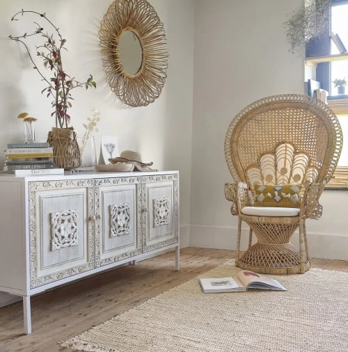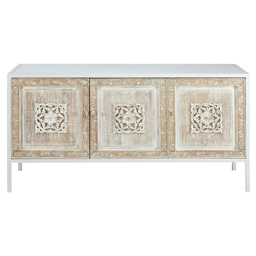 Robuste grâce à sa fabrication en manguier massif, ce buffet 3 portes abrite un beau volume de rangement, agrémenté d’une étagère. Le détail déco : les portes sont sculptées à la main, ce qui rend chaque modèle unique.</p><p>À associer avec une étagère plus épurée, pour mettre en valeur tous vos souvenirs de voyage.</p>
