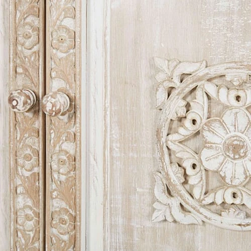 Portes sculptées à la main : manguier, finition peinture acrylique (sans solvant) blanche, finition vieillie et cirée