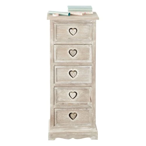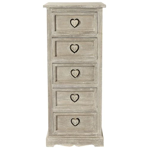 Offrez une touche de romantisme à votre chambre avec la colonne de rangement grisée effet vieilli CAMILLE. Cet adorable meuble en bois lasuré blanc et grisé se compose de 5 tiroirs pour ranger vos petites affaires. Avec un cœur pour chaque poignée, ce meuble de rangement pratique et peu encombrant, apportera une note féminine à votre déco de chambre romantique. Complétez cet univers poétique avec la coiffeuse, le secrétaire et la commode de la même collection.</p>