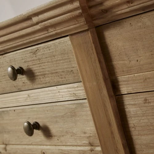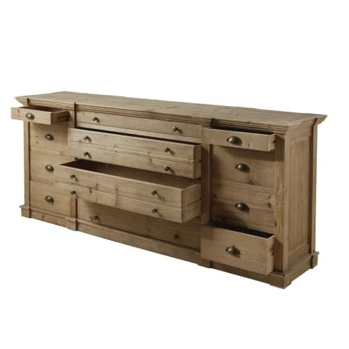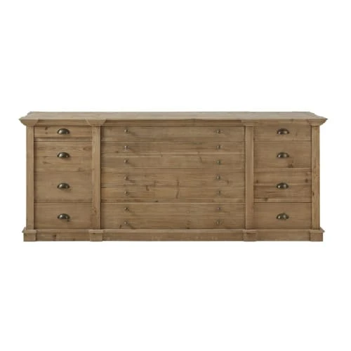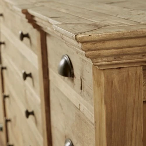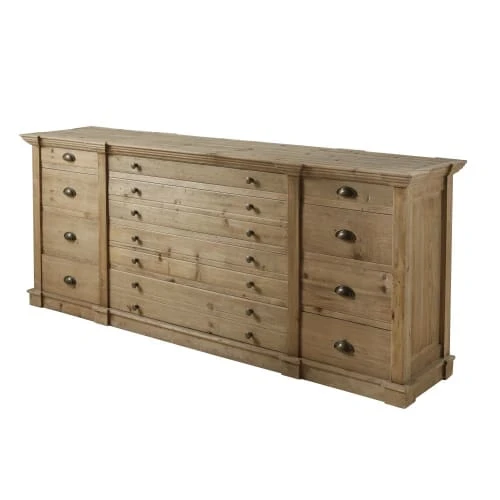 Conçu en pin recyclé, le comptoir 12 tiroirs SPINOZA vous garantira une solidité à l’épreuve du quotidien. La finition légèrement grisée du bois ajoute un aspect unique et authentique. Le détail qui fait mouche ? Les poignées en métal au coloris laiton vieilli, qui donnent encore plus de cachet à ce comptoir. Il ne vous reste plus qu’à lui trouver une place de choix et à y ranger vos petites affaires. Entrée, salon, salle à manger… Laissez parler vos envies !</p>