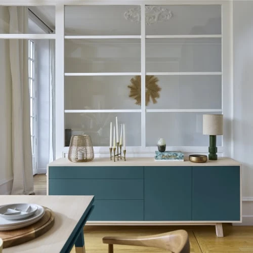 – Le tiroir du haut est plus étroit que les 2 autres et sert de rangement aux couverts, sets de table et objets plats. 2 séparations amovibles en bois à l’intérieur de ce tiroir vous permettent de régler la taille de chaque compartiment. Vous pouvez aussi retirer ces séparateurs si vous souhaitez un seul espace de rangement pour le tiroir du haut.