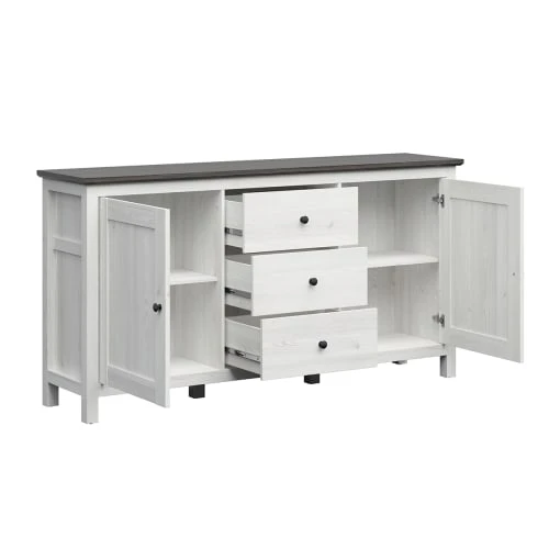 Buffet 2 portes 3 tiroirs Duck Blanc et bois foncé Fabrication Européenne – Collection : Duck – Couleur : Blanc patiné et bois foncé – Matériaux : Panneaux MDF et mélaminés – Caractéristiques: 2 portes – 2 étagères – 3 tiroirs – Portes et tiroirs équipés du système de fermeture silencieuse – Poids et Dimensions : 76kg – 186 x 44 x 96 cm – Produit livré, à monter – Produit garanti 12 Mois.