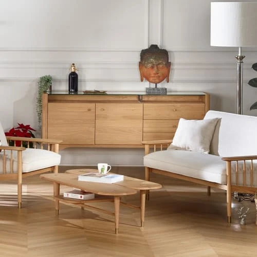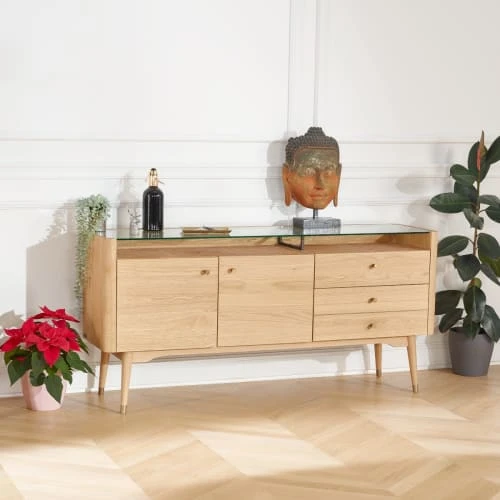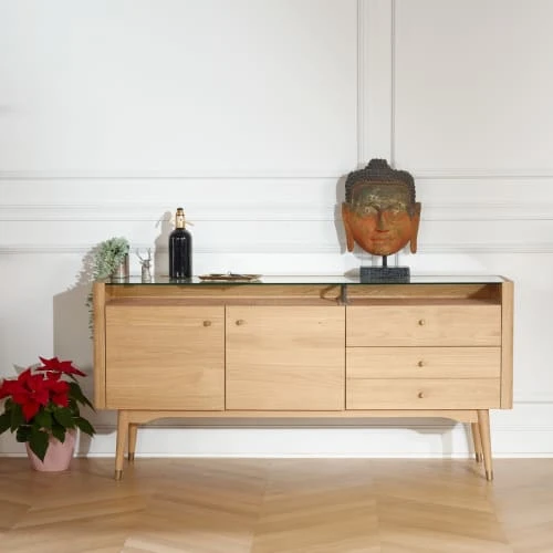 Buffet en chêne LEON :- Meuble en chêne massif plaqué sur médium avec emboîtures en chêne massif- Niche avec fond en cannage et tablette en verre trempé – 2 portes battantes avec fermeture silencieuse en chêne et panneau de médium.- 1 tablette fixe à l’intérieur, sur toute la longueur – 2 tiroirs- Boutons poignées en chêne- Pieds chêne massif, finition laiton- Patins plastiquesDimensions totales du buffet LEON :Longueur : 165 cmHauteur: 78 cmProfondeur: 43 cmpoids : 69 kgLivraison chez vous:Votre buffet LEON est livré déjà assemblé. Seuls les pieds du meuble sont à monter. Il sera livré chez vous sur jour de rendez-vous, en pas de porte ou à l’étage.Attention ! Veuillez vérifier que les ouvertures (portes, escaliers, ascenseurs) permettront le passage du/des colis lors de la livraison.Dimensions et poids du colis : L 173 X H 51 X P 66 cm, 76 kgConseils d’entretien pour votre meuble :- Époussetez fréquemment avec un chiffon propre, sec et non pelucheux- Ne pas utiliser de vernis, de cire, de produits huileux, d’alcool, de dissolvant ni de parfum- Évitez d’exposer votre meuble au soleil : une exposition prolongée peut décolorer la finition du meuble- Ne tirez pas votre meuble si vous le déplacez : soulevez-le afin d’éviter des rayures sur votre sol. Prévenez les livreurs avant qu’ils rentrent chez vous lors de la livraison.- À réception de votre meuble, veillez à bien aérer, portes et tiroirs dans une pièce bien ventiléeAVERTISSEMENT DE SÉCURITÉ : Information importante si votre meuble est muni d’une attache murale. En cas de chute du meuble, il y a un risque de blessures graves. Pour éviter que le meuble ne bascule, il faut le fixer au mur de façon permanente. Les fixations murales ne sont pas incluses car leur choix dépend du matériau du mur. Nous vous conseillons alors de vous adresser à un revendeur spécialisé pour obtenir des conseils sur les fixations adaptées à votre type de mur.